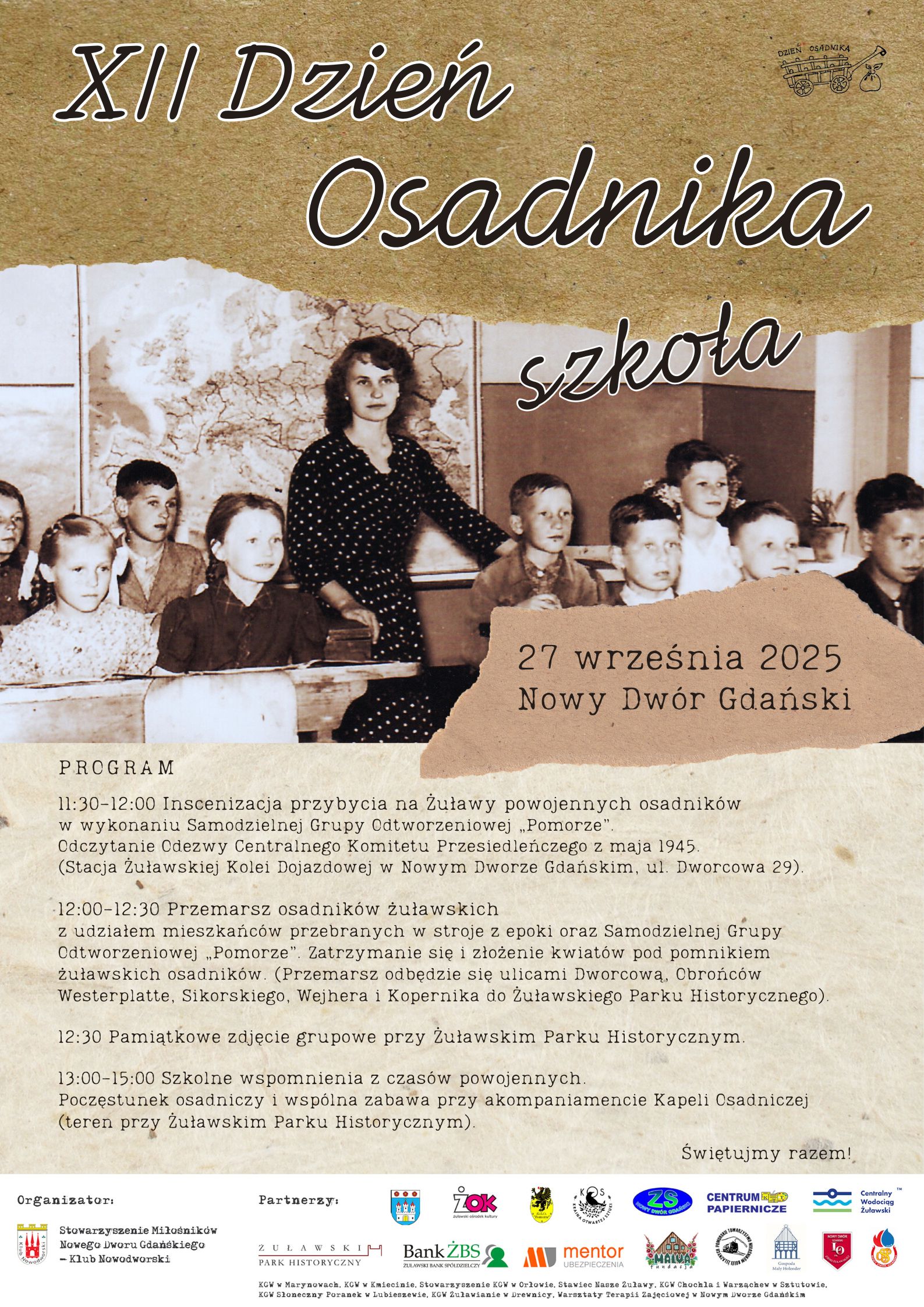 13:00-15:00 Szkolne wspomnienia z czasów powojennych. Poczęstunek osadniczy i wspólna zabawa przy akompaniamencie Kapeli Osadniczej (teren przy Żuławskim Parku Historycznym).