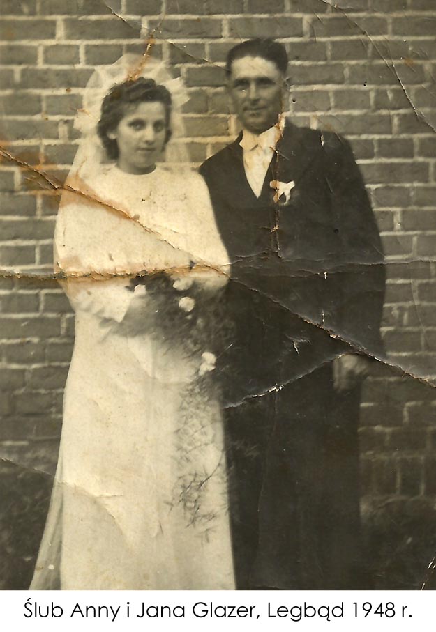 AG: Jo. I my przyszli z wojny, jedna przyjechała do Heli i tak się na mnie patrzy: „Ty wiesz co, ja Ciebie ożenię”, a ja mówię: „Chyba z kotem”. Ja mówię: „Żenić się?, jak ja dopiero co na suknię muszę sobie zarobić”. No i pojechała, nic więcej nie mówiła. Ale z tym teściem moim – Glazrem – ona się też znała i mi pracę wynalazła. Poszłam do Legbąda za gospodynię do Teodora Glazera. Ale długo tak nie siedziałam, bo on stale mówił: „Byś mogła wziąć tego Jana i się ożenić”. A to jego syn był, miał 36 lat, z Niemiec z robót wrócił. Pobraliśmy się 1948r. Ślub był w Legbądzie, bo mój teść mówił: „ Nie masz matki, to ja ci wesele zrobię”. A tata był zły, toć mówił: „Ja jeszcze żyję”.