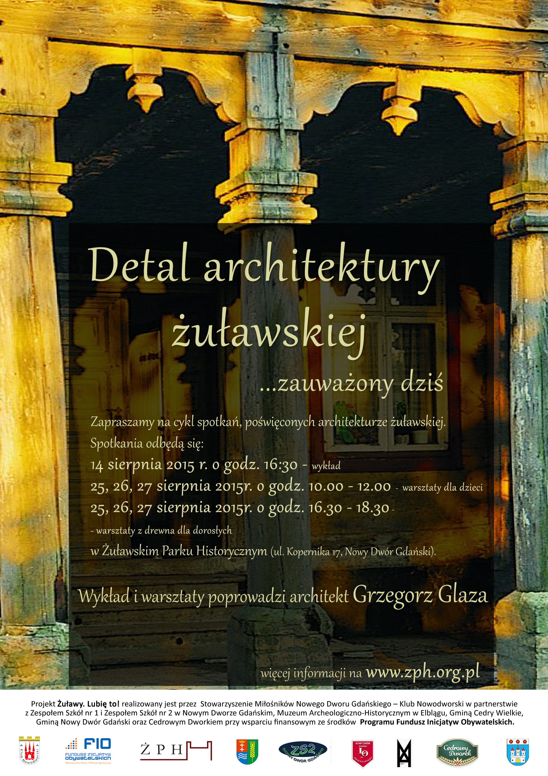 Pędź w pośpiechu do ŻPHu! Dlaczego? Ponieważ rozpoczynamy cykl interesujących spotkań po hasłem Detal architektury żuławskiej. Na wykład oraz warsztaty zaprasza poznański architekt Grzegorz Glaza. Pierwsze spotkanie odbędzie się dnia 14 sierpnia 2015 r. o godz. 16.30 do Sali Konferencyjnej Żuławskiego Parku Historycznego. Wstęp na wykład jest bezpłatny.