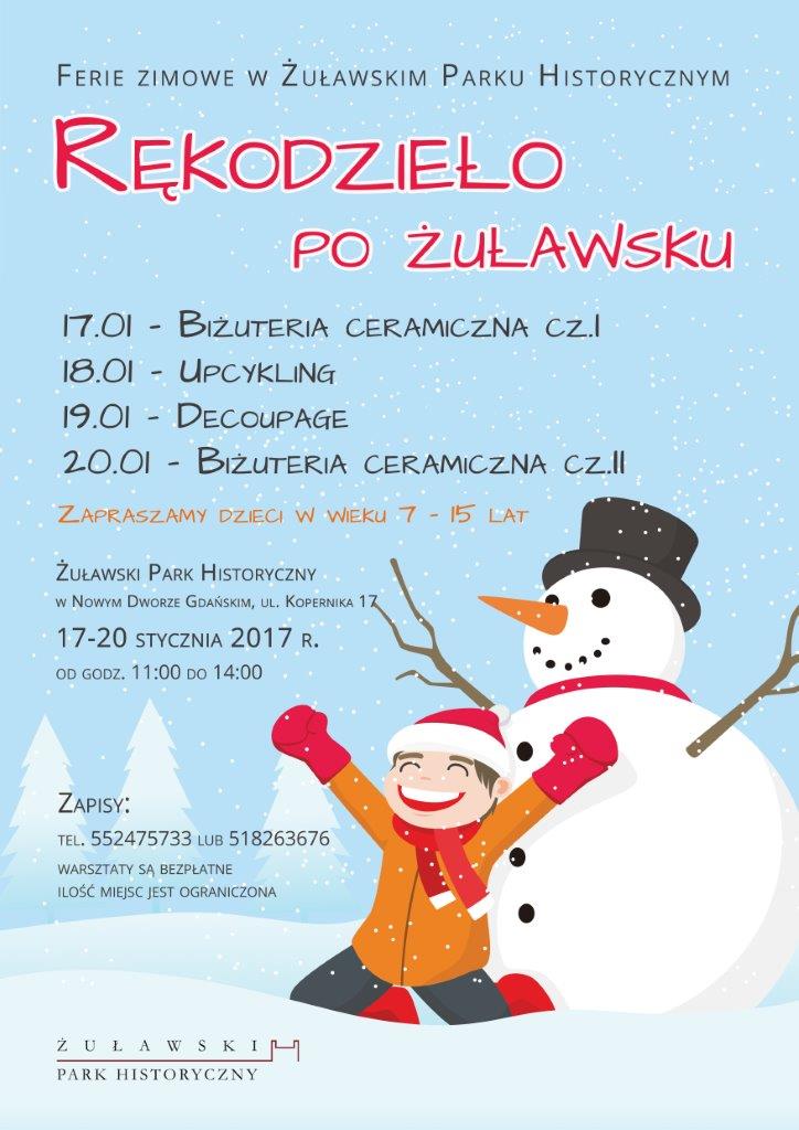 Już w pierwszym tygodniu ferii odbędą się rękodzielnicze zajęcia pod wspólnym hasłem „Rękodzieło po żuławsku!” We wtorek 17 stycznia i piątek 20 stycznia zapraszamy na warsztat lepienia i ozdabiania biżuterii ceramicznej. W środę 18 stycznia ze śmieci (opakowań po szamponie, mydle, płynie do mycia naczyń, rolek po