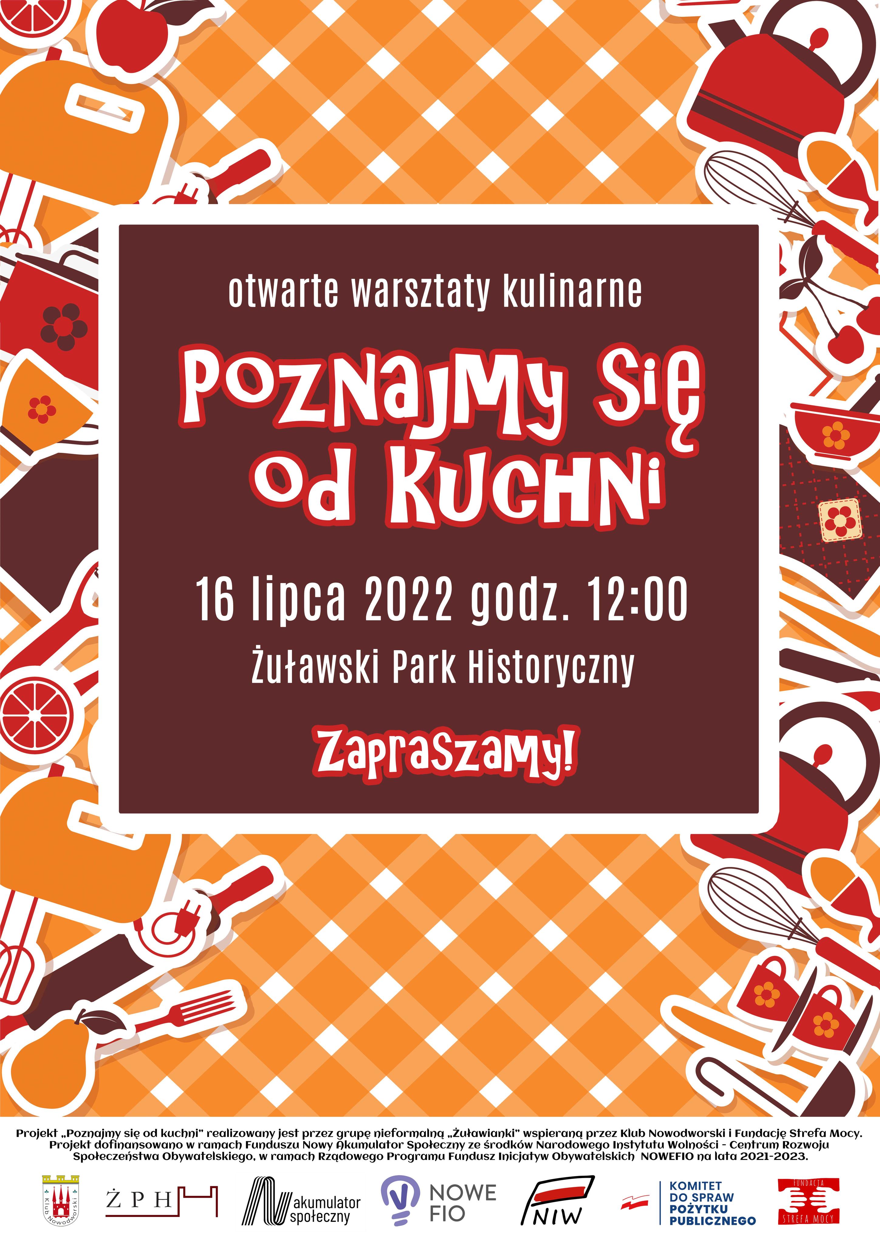 W sobotę 16 lipca 2022 r. zapraszamy na otwarte warsztaty kulinarne "Poznajmy się od kuchni". W trakcie zajęć wspólnie przygotujemy tradycyjne potrawy kuchni polskiej i ukraińskiej. Początek o godz. 12.00.