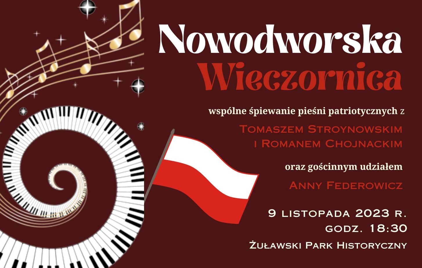 Zapraszamy na Nowodworską Wieczornicę, czyli wspólne śpiewanie razem z fantastycznymi muzykami – Tomaszem Stroynowskim i Romanem Chojnackim oraz zaproszonymi gośćmi. W czwartkowy wieczór, z okazji nadchodzącego Narodowego Święta Niepodległości, w Sali Dwukolumnowej w Żuławskim Parku Historycznym wybrzmią znane pieśni i piosenki patriotyczne. Tak jak w poprzednich latach, będziemy je śpiewać RAZEM. Zachęcamy do przybywania całymi rodzinami!