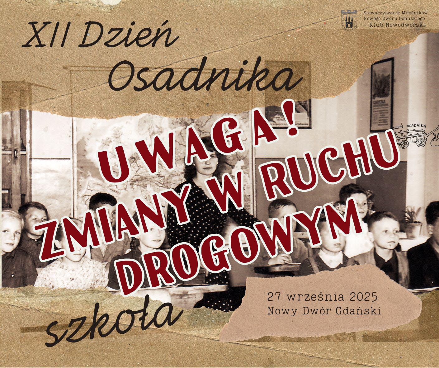 UWAGA ZMIANY W RUCHU DROGOWYM! Drodzy Mieszkańcy Nowego Dworu Gdańskiego! W najbliższą sobotę odbędzie się XII Dzień Osadnika – Święto Żuławiaków! W związku z tym informujemy, że 27 września, między godziną 12:00 a 12:30 na trasie: ul. Dworcowa, Obrońców Westerplatte, Sikorskiego, Wejhera i Kopernika mogą wystąpić utrudnienia w ruchu ulicznym.