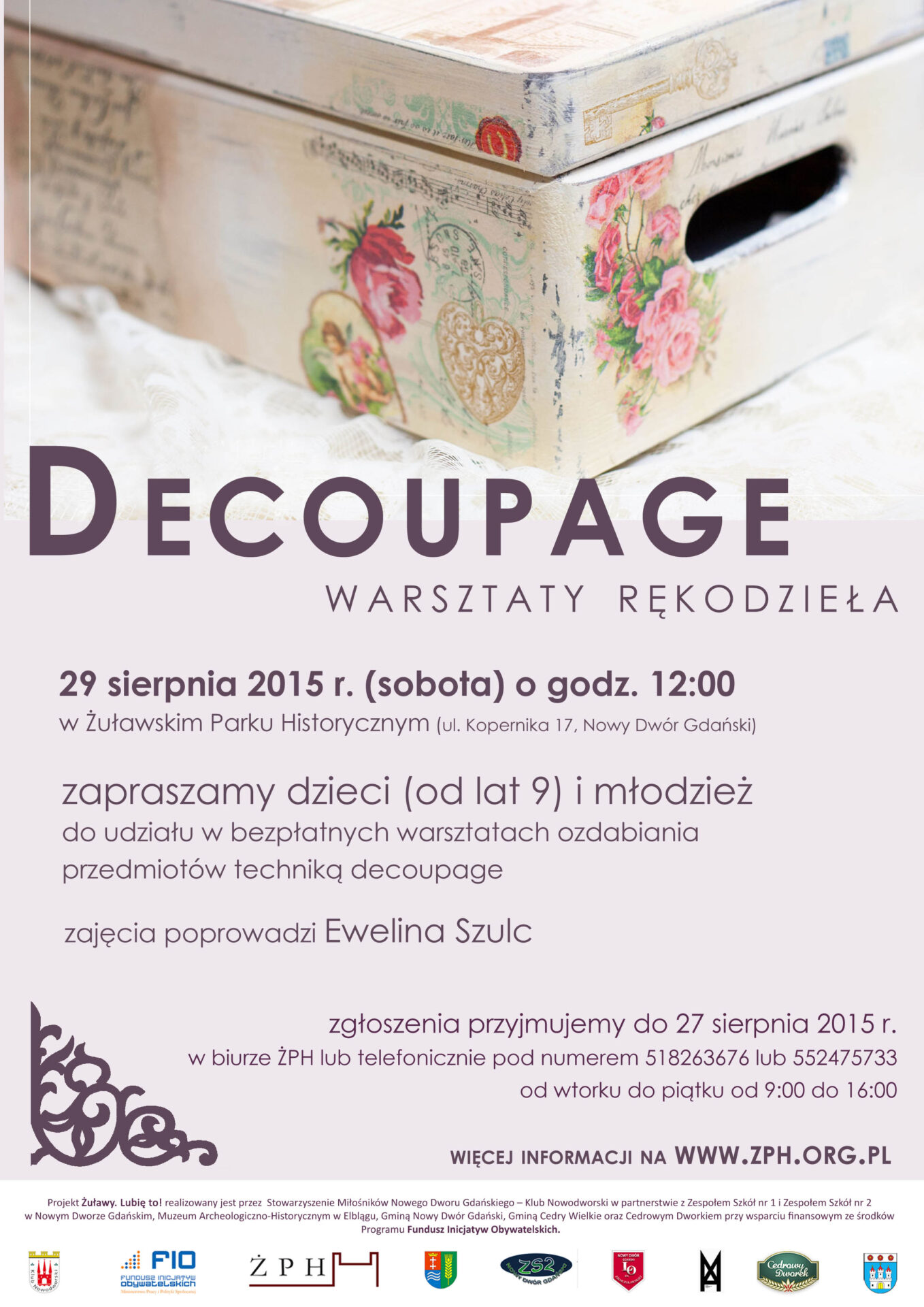 Zapraszamy dzieci (od 9 lat) i młodzież na warsztaty rękodzieła, które odbędą się 29 sierpnia 2015 r. o godz. 12:00 w Żuławskim Parku Historycznym. Tym razem będziemy uczyć się zdobienia przedmiotów techniką decoupage, wykorzystamy w tym celu motywy inspirowane Żuławami.