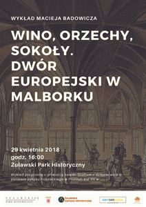 W świat średniowiecznych uczt i form spędzania wolnego czasu zabierze nas Maciej Badowicz z Instytutu Historii Uniwersytetu Gdańskiego. Wykład Wino, orzechy i sokoły. Dwór Europejski na zamku w Malborku odbędzie się 29 kwietnia 2018 r. w Żuławskim Parku Historycznym (wyjątkowo w budynku muzeum) o godz. 16:00.