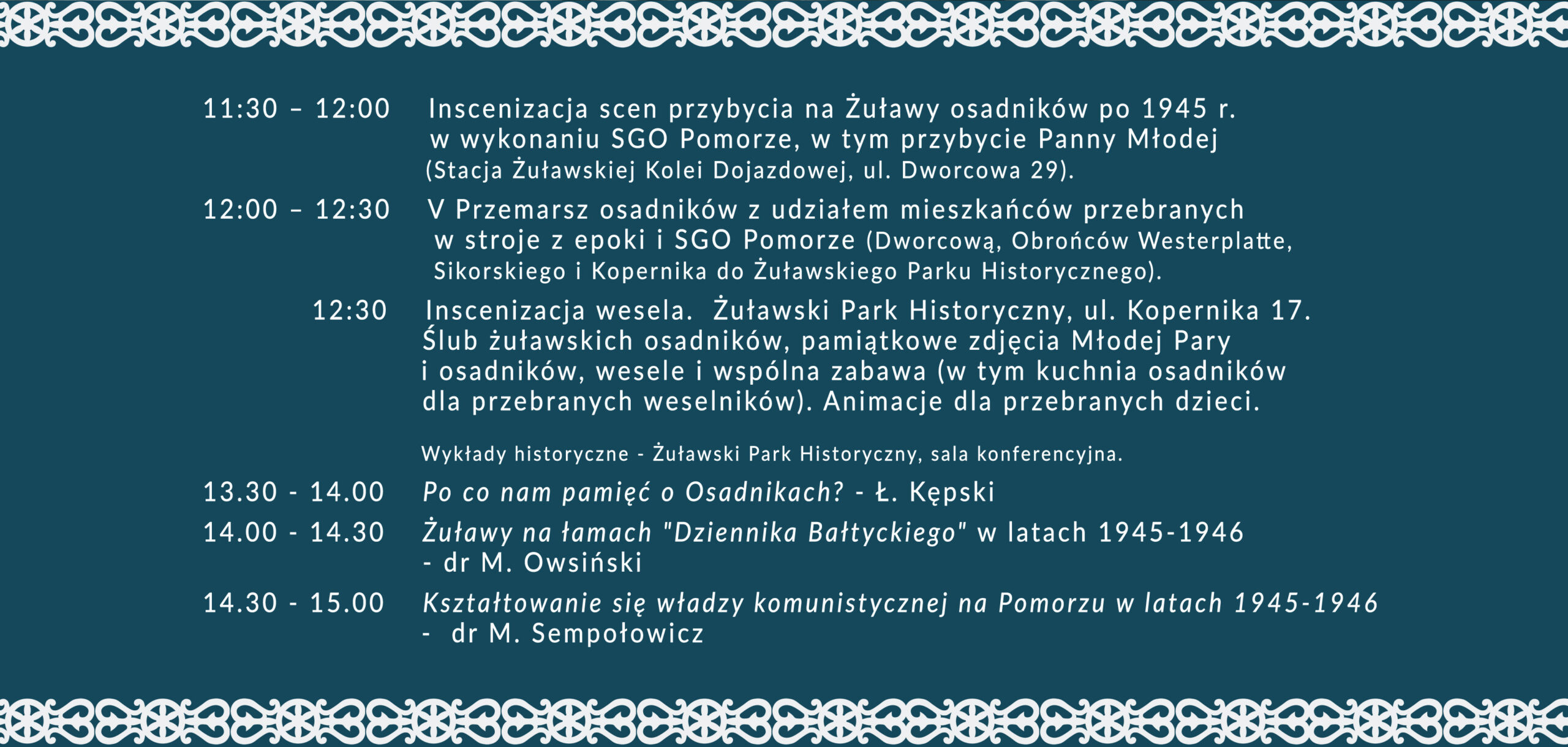 Inspiracją stały się wspomnienia jednego z osadników, pana Józefa Liguzy, które zostaną odczytane podczas inscenizacji. Jak co roku do święta, zainicjowanego i organizowanego przez Stowarzyszenie Miłośników Nowego Dworu Gdańskiego – Klub Nowodworski, przyłącza się Samodzielna Grupa Odtworzeniowa „Pomorze”, organizując scenki z lat 40-tych. W tym roku wzbogacone o zwyczaje i obrzędy ślubno-weselne. O oprawę muzyczną, która w tym roku będzie odgrywać istotna rolę w inscenizacji, zadba Żuławski Ośrodek Kultury, angażując swoje chóry i zespoły, również szkoła muzyczna KOS – Kraina Otwartej Sztuki. Elementem równie ważnym jak poprzednie będzie kuchnia osadnicza. Organizację przedsięwzięcia wzięła na siebie jedna z naszych wolontariuszek – Maria Bernacka we współpracy z Sołectwem Lubieszewo. Pojawią się więc m.in. przecieraki okraszone, placuszki, zalewajka ziemniaczana, drożdżówka, smalec, cukierki z patelni, kawa zbożowa, domowy kompot. I oczywiście tradycyjny, powojenny tort. Ale uwaga! Kuchnia to też element inscenizacji, głodnych gości obowiązuje strój osadniczy.